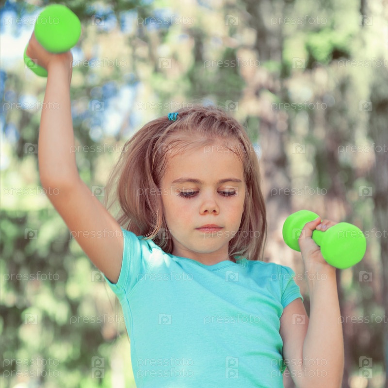 Девочка поднимает гантели в парке