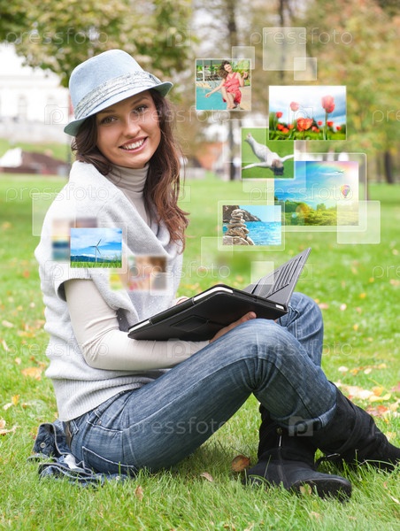 Женщина обменивается фотографиями с помощью планшетного компьютера