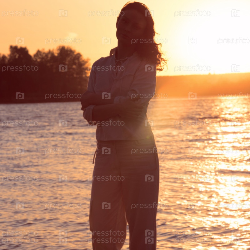 Молодая женщина на пляже в лучах заката