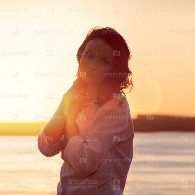 Молодая женщина на пляже в лучах заката