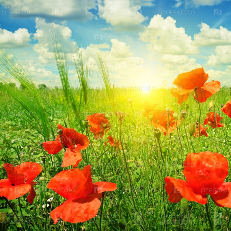 Поле маков в лучах солнца