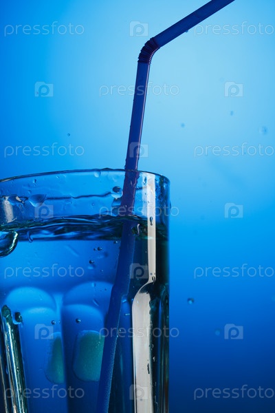 Стакан воды с соломинкой, синий фон