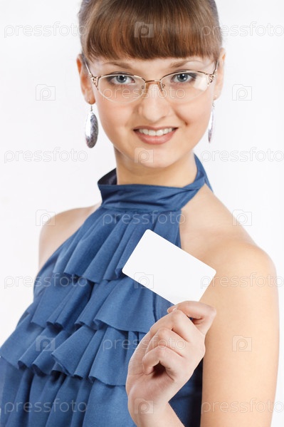 Девушка в синей блузе держит пустую визитную карточку. Студийный портрет