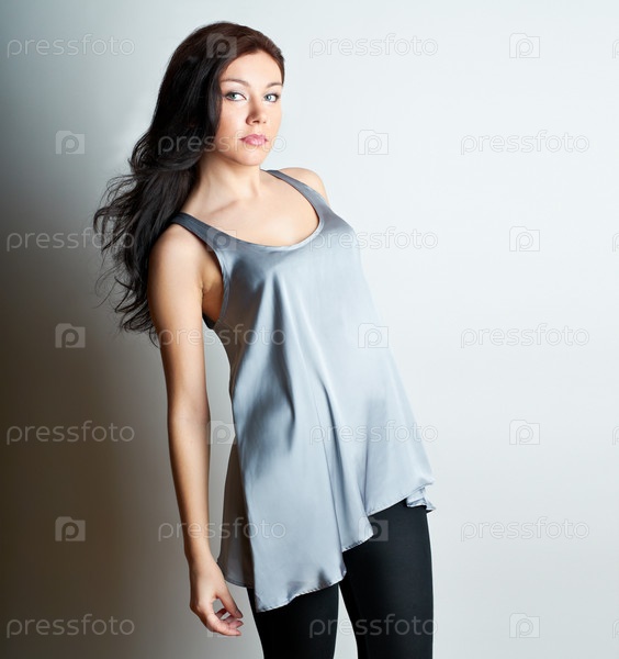 Молодая, темноволосая женщина на светлом фоне