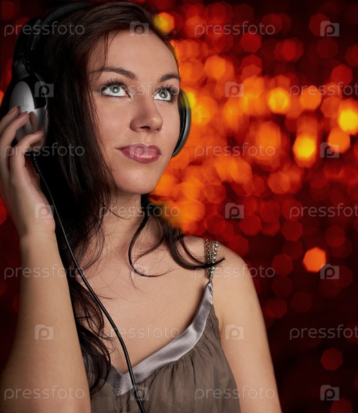 Темноволосая девушка в наушниках слушает музыку