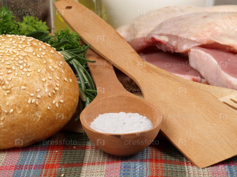 Сырое мясо и кухонные принадлежности