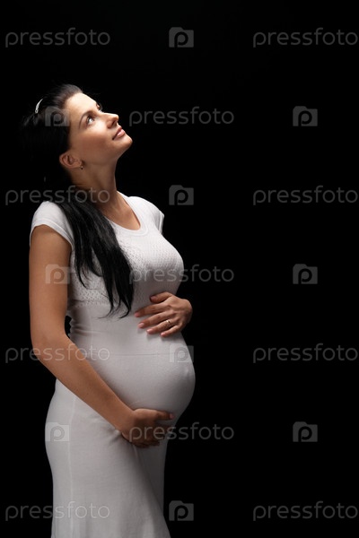 Беременная девушка в белом платье на черном фоне