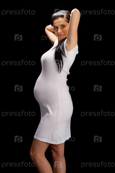 Беременная девушка в белом платье на черном фоне