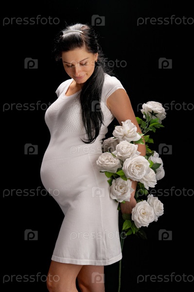 Беременная девушка в белом платье с розами на черном фоне
