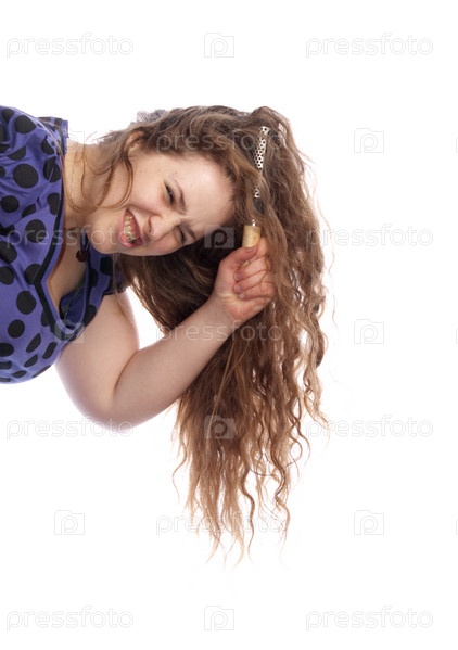 Женщина мучается с длинными волосами