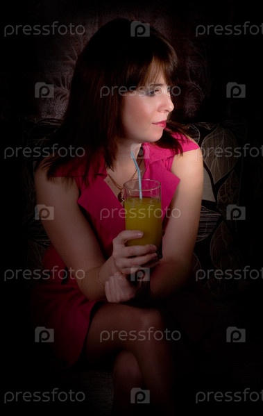 Красивая девушка с коктейлем сидит в темной комнате