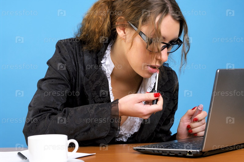 Симпатичная деловая женщина красит губы перед ноутбуком