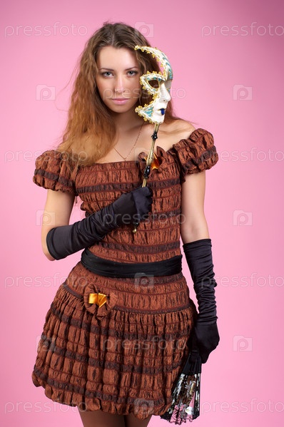 Молодая красивая женщина в платье с маской и веером на розовом фоне