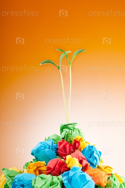 Два саженца, проросшие из мятой бумаги на оранжевом фоне