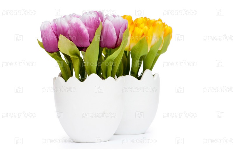 Яркие тюльпаны в горшке на белом фоне