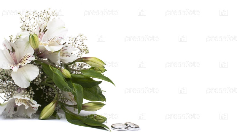 Букет цветов и обручальные кольца на белом фоне