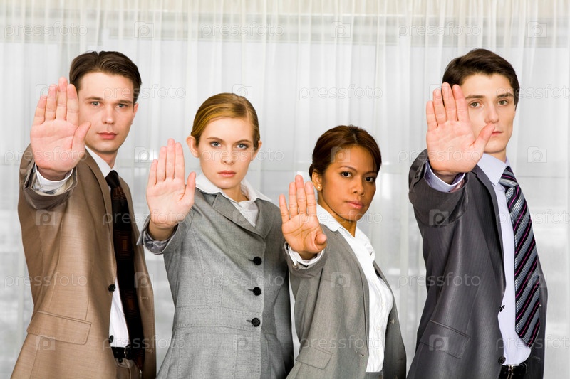 Фото деловых людей, стоящих в очереди и показывающих знак стоп за ладонями