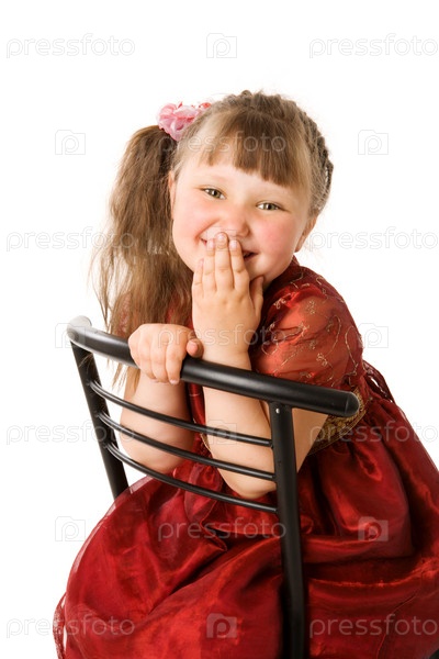 Девочка в нарядном красном платье, сидящая на стуле, изолированная на белом фоне