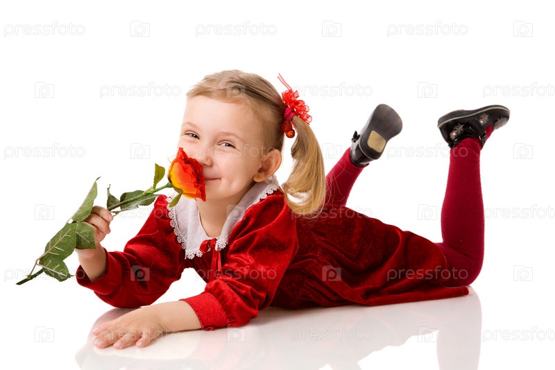 Маленькая девочка в красном платье лежит на полу с розой в руке