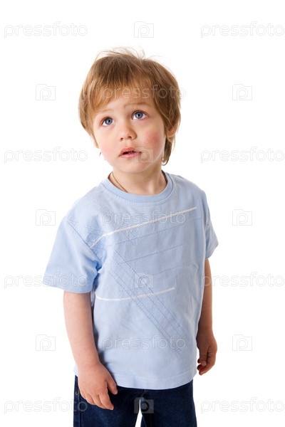 Задумчивый маленький мальчик, изолированный на белом фоне