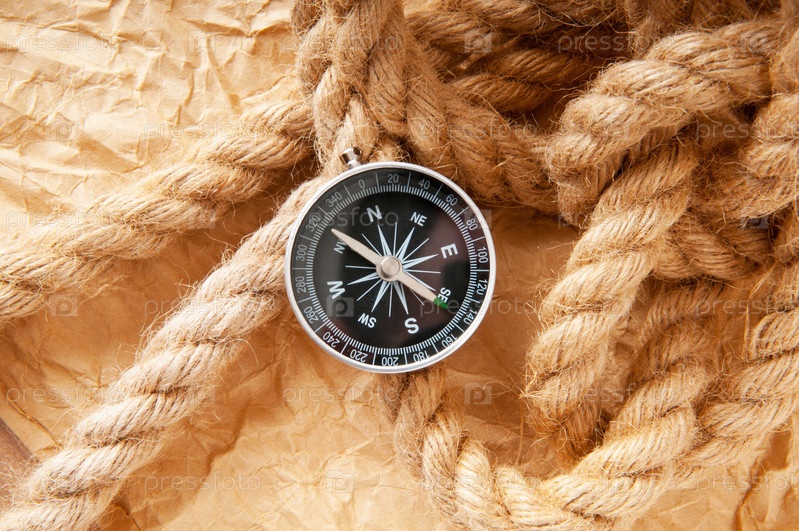 Компас и веревки, концепция путешествий и приключений