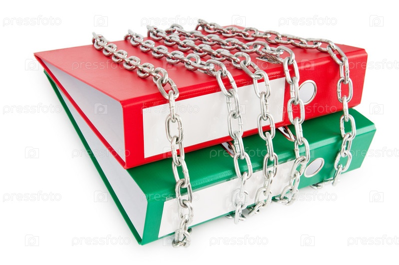 Офисные папки, скрепленные цепью, изолированные на белом фоне