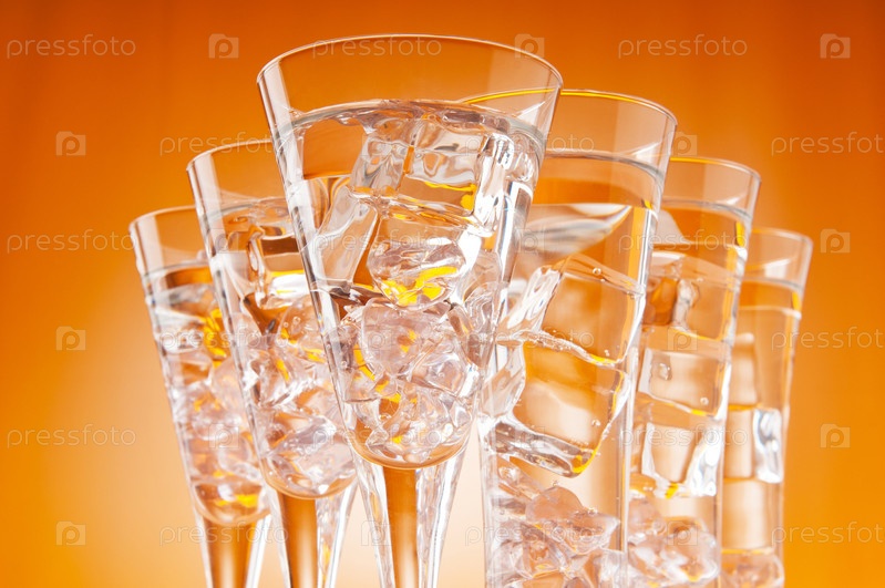 Вода со льдом в стеклянных фужерах и стаканах на оранжевом фоне