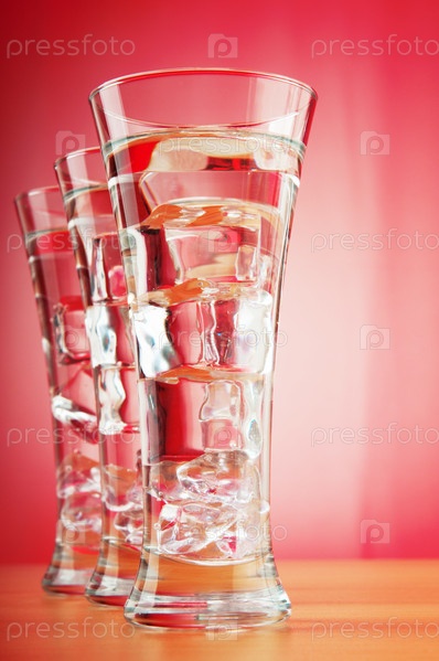 Вода со льдом в стеклянных стаканах на розовом фоне