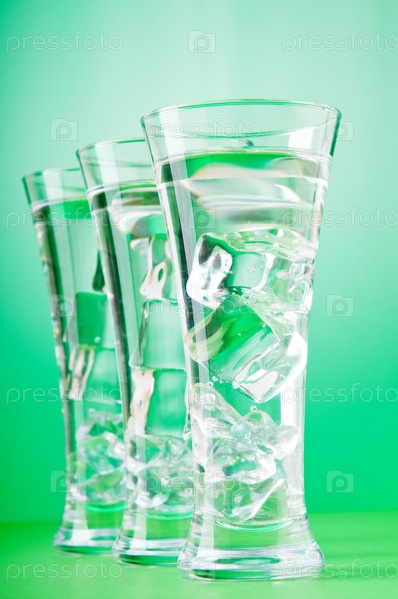 Вода со льдом в стеклянных стаканах на зеленом фоне