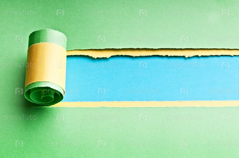 Рваная зеленая и желтая бумага на синем фоне