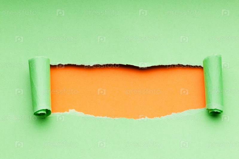 Рваная зеленая бумага на оранжевом фоне