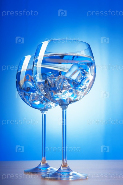 Бокалы с водой и льдом на синем фоне