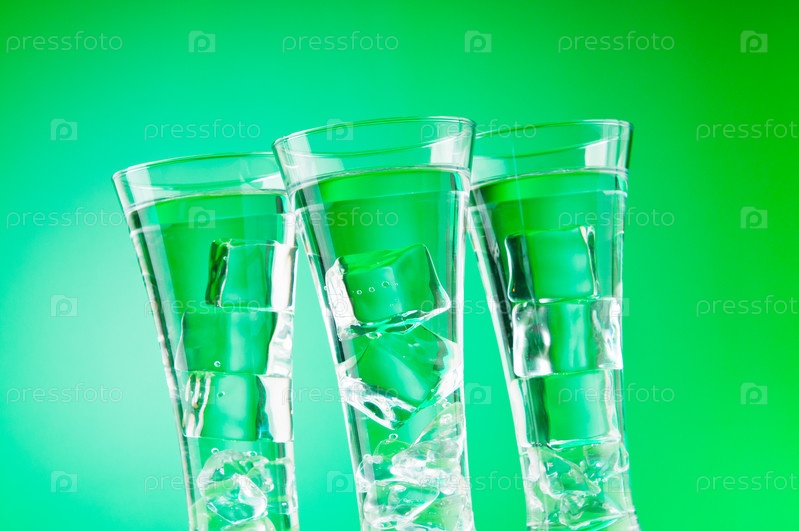 Бокалы с водой и льдом на зеленом фоне