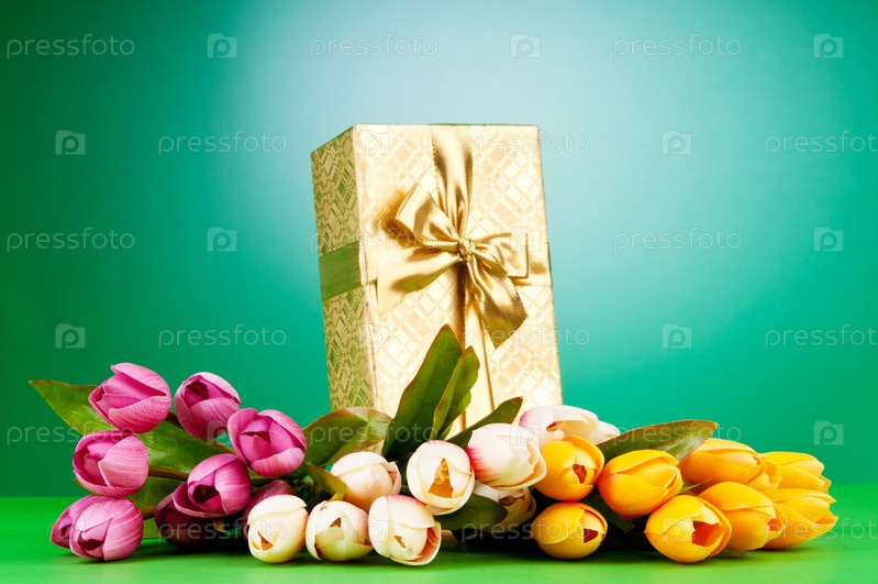 Подарочная коробка и тюлпаны