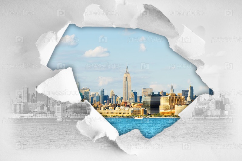 Вид на город Нью-Йорк через отверстие в бумаге