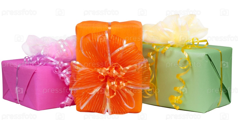 Разноцветные подарочные коробки на белом фоне