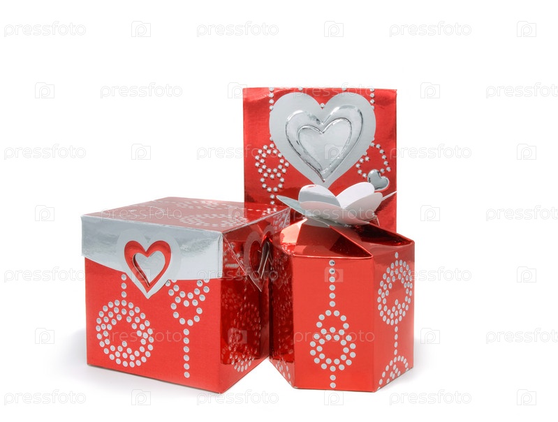 Три красные упаковки для подарков на белом фоне