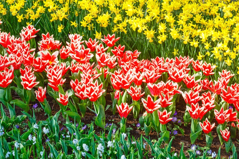 Красно-белые тюльпаны и желтые нарциссы
