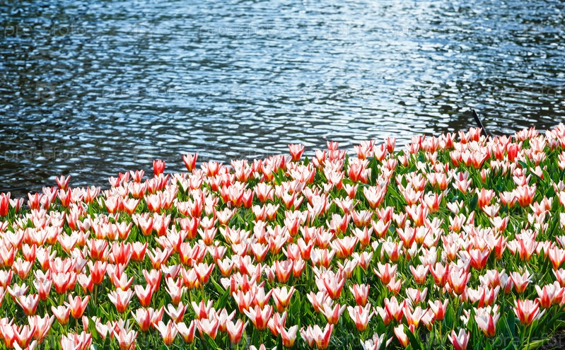 Красно-белые тюльпаны возле пруда