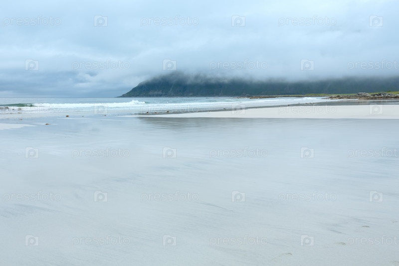 Пляж Рамберг в пасмурную погоду. Лофотенские острова, Норвегия