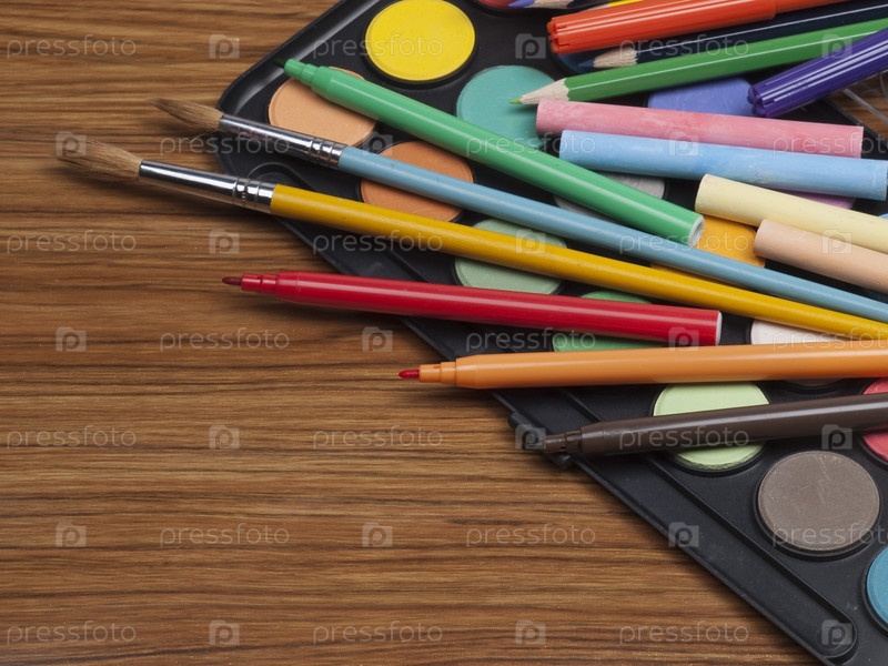 Краски, кисти, карандаши, мелки, фломастеры на деревянной поверхности