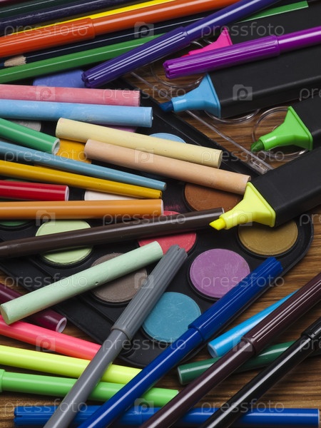 Краски, кисти, карандаши, мелки, фломастеры и маркеры на деревянной поверхности