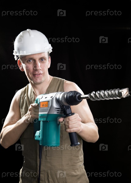 Строитель в каске с профессиональным перфоратором