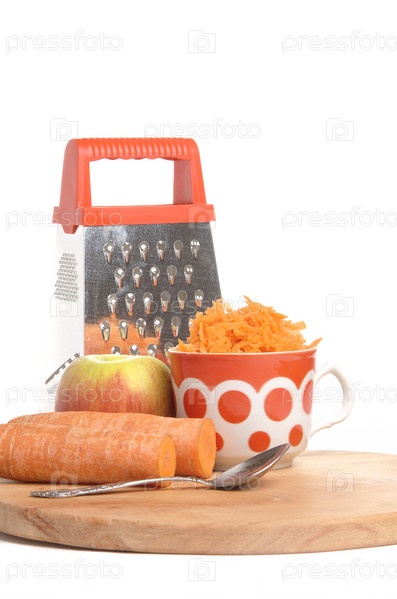 Тертая морковь в чашке и яблоко на белом фоне