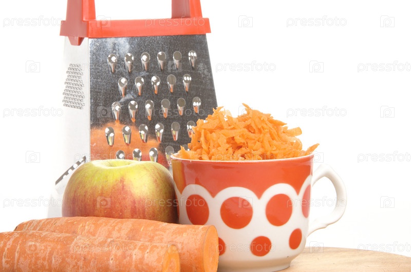 Тертая морковь в чашке и яблоко на белом фоне