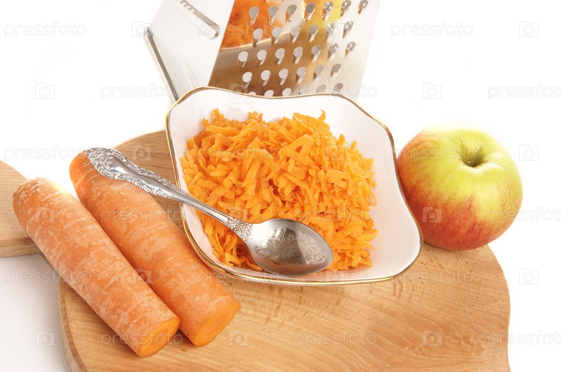 Тертая морковь в чашке и яблоко на белом фоне