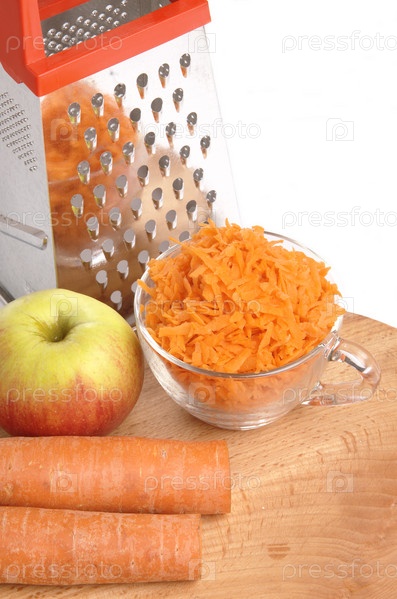 Тертая морковь в чашке и яблоко на белом фоне