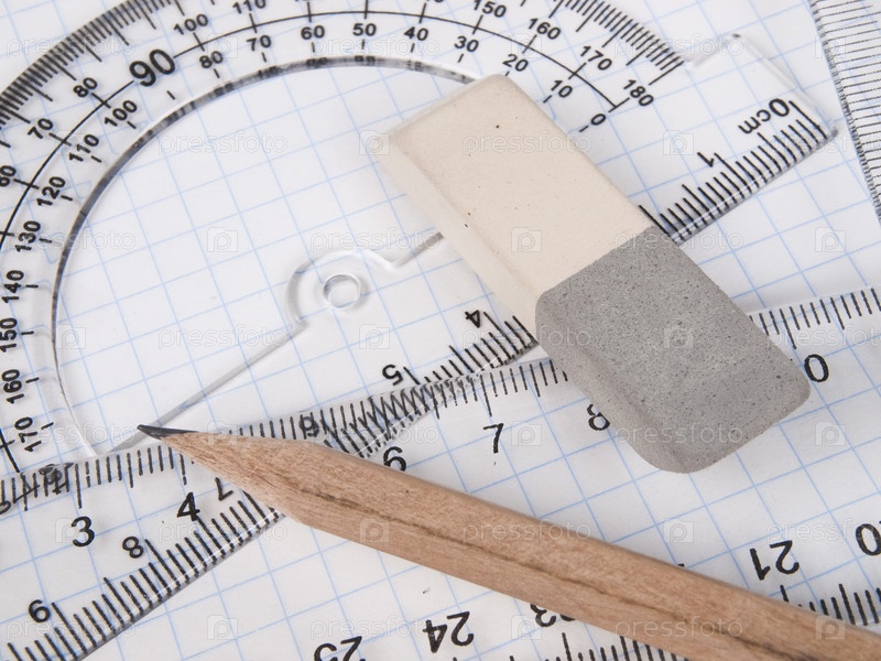 Транспортир, карандаш, линейка и ластик, лежащие на тетради