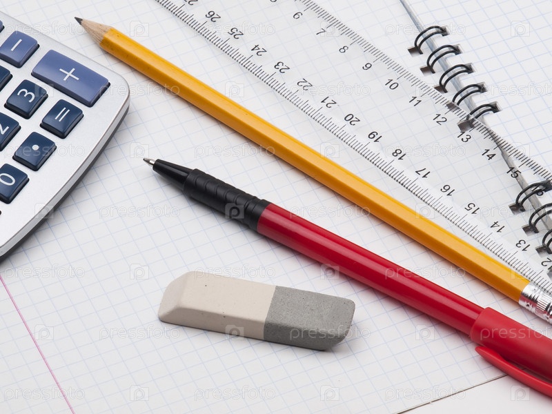 Транспортир, ручка, калькулятор, карандаш, линейка и ластик, лежащие на тетради