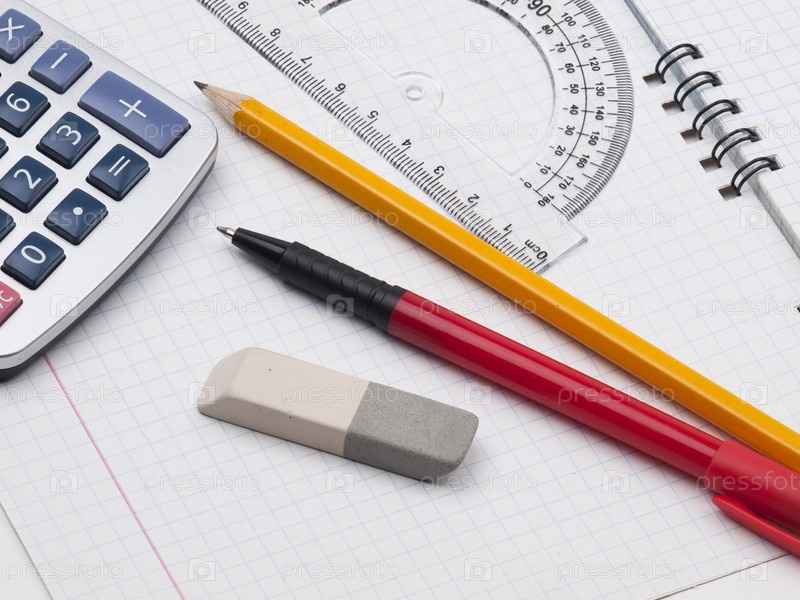 Транспортир, ручка, калькулятор, карандаш, линейка и ластик, лежащие на тетради